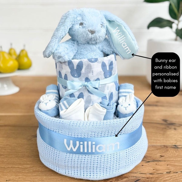 A beautiful and practical Personalised gift for a little one, this Bunny Nappy Cake includes: