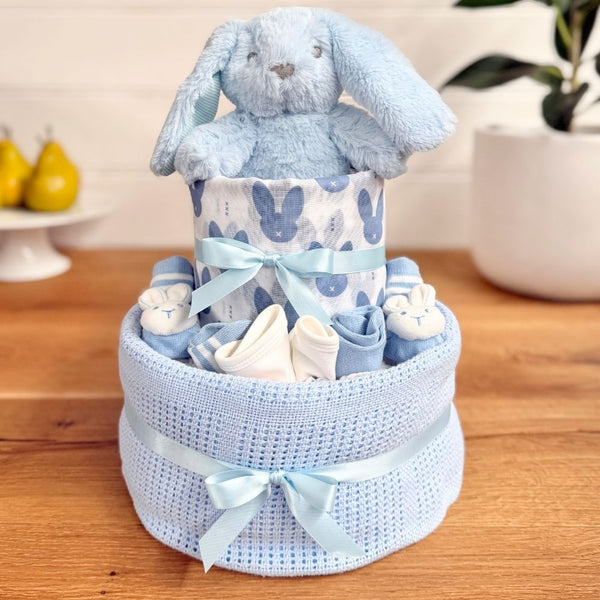 A beautiful and practical gift for a little one, this Bunny Essentials Nappy Cake includes: