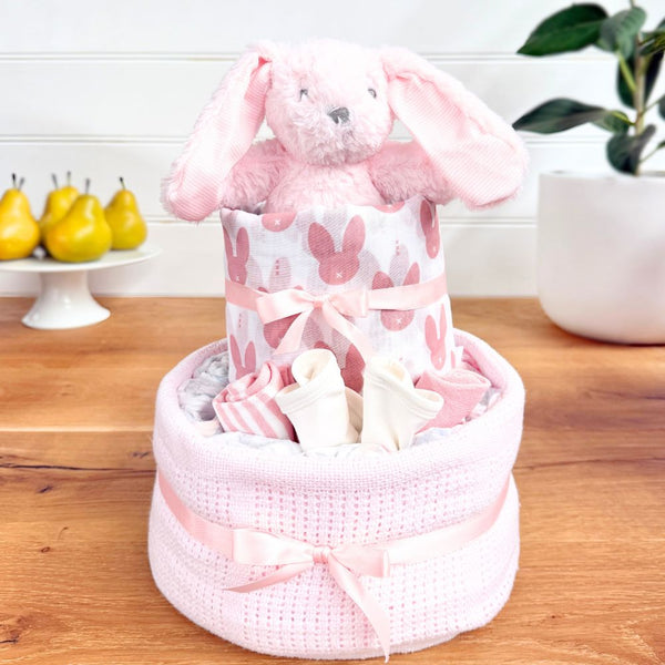 A beautiful and practical gift for a little one, this Bunny Baby Nappy Cake includes: